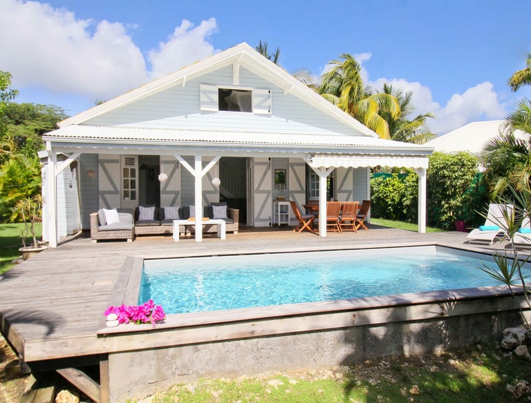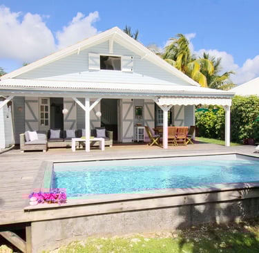 Charmante maison traditionnelle créole en bois, ambiance chaleureuse et terrasse ombragée, avec piscine privative. Idéale comme résidence secondaire ou gîte.