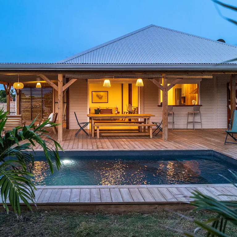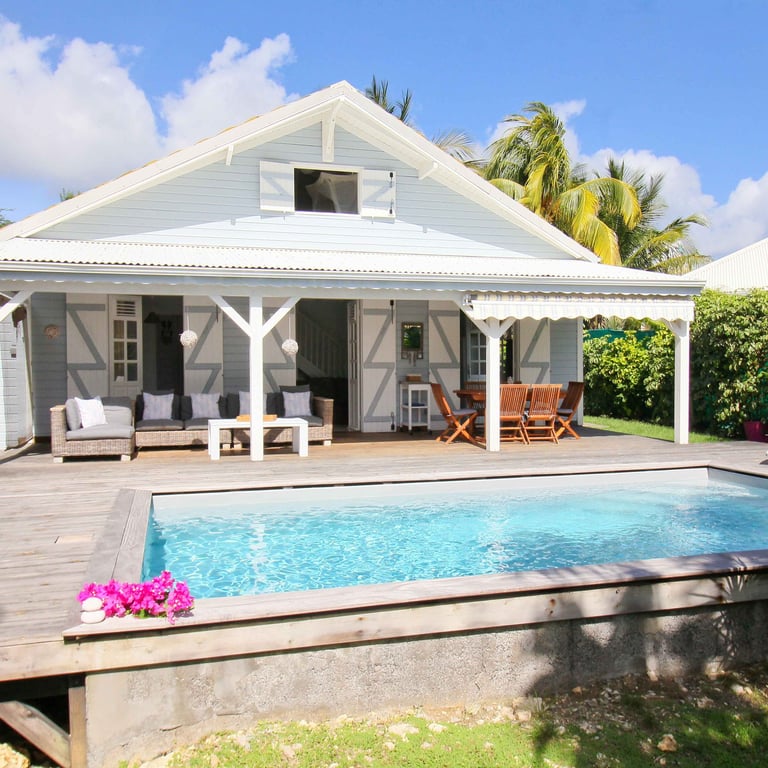 Nichée au cœur d’un écrin de verdure tropicale, cette magnifique maison de style caribéen séduit par son architecture traditionnelle alliée à des finitions modernes. Dès l’entrée, on découvre un vaste deck en bois exotique entourant une piscine cristalline, parfaite pour se détendre à l’ombre des palmiers. L’intérieur, baigné de lumière naturelle, offre un grand séjour ouvert sur l’extérieur, une cuisine fonctionnelle et des chambres spacieuses à la décoration chaleureuse. Le jardin, soigneusement aménagé, regorge d’essences locales et de coins cosy pour lire, recevoir ou rêver. Un véritable havre de paix, idéal pour vivre à l’année ou profiter de séjours inoubliables sous le soleil guadeloupéen.